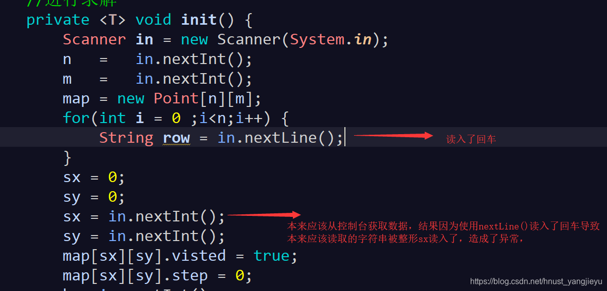 row = in.nextLine();//会读入我们的换行符,导致一系列的错误